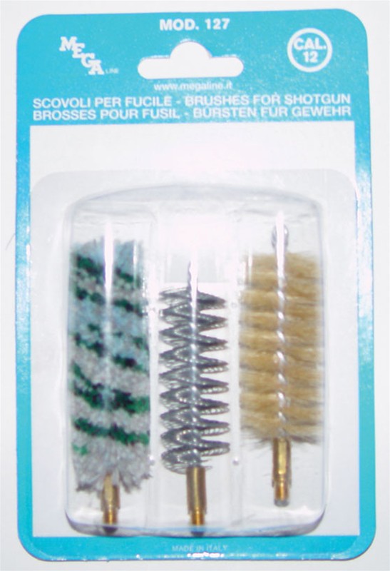 Three 12 Ga shotgun cleaning brushes packed on blister card. It includes one colored cotton brush, one steel spiral brush and one bronze brush.