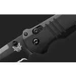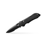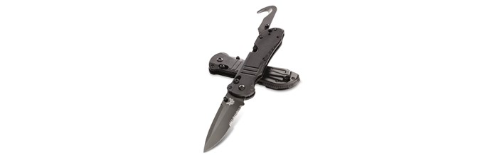 This Benchmade Tactical Triage 917SBK model sports a premium CPM-S30V steel blade in a black finish with a partially serrated edge and a black G-10 handle.